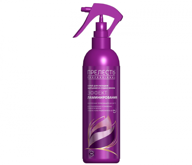 Например, спрей Прелесть Professional «Эффект ламинирования». Он защищает волосы от воздействия высоких температур, делает их более гладкими и блестящими.