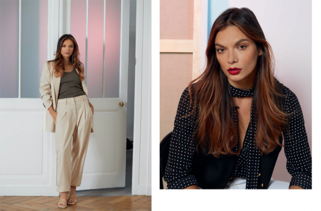 Чтобы пряди ниспадали легкой волной, сохраняя свою естественность, уложите их при помощи мусса Mousse Légère mod’s hair. Доминирующим элементом образа является балаяж Surfer Contouring mod’s hair в персиковых оттенках, которые выгодно подсвечивают лицо. В одежде выдержан элегантный парижский стиль. Сияющие тени для век смягчают ярко-красный цвет помады, а жилет мужского кроя уравновешивает глубокое декольте. Благодаря движению волос в укладке, блики на волосах играют ярче (это вновь теплые тона). Слегка зафиксируйте прическу небольшим количеством спрея Vento mod’s hair.