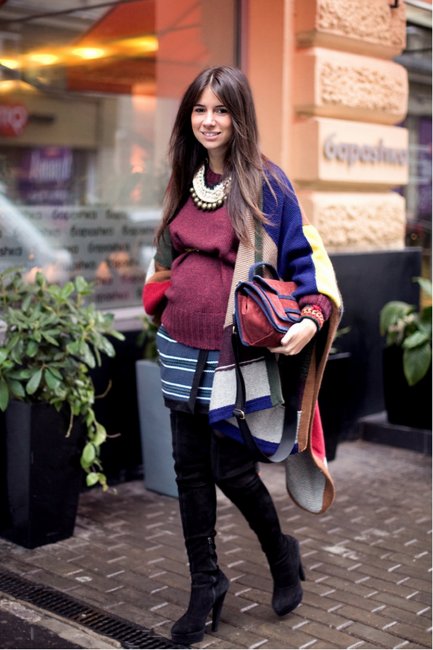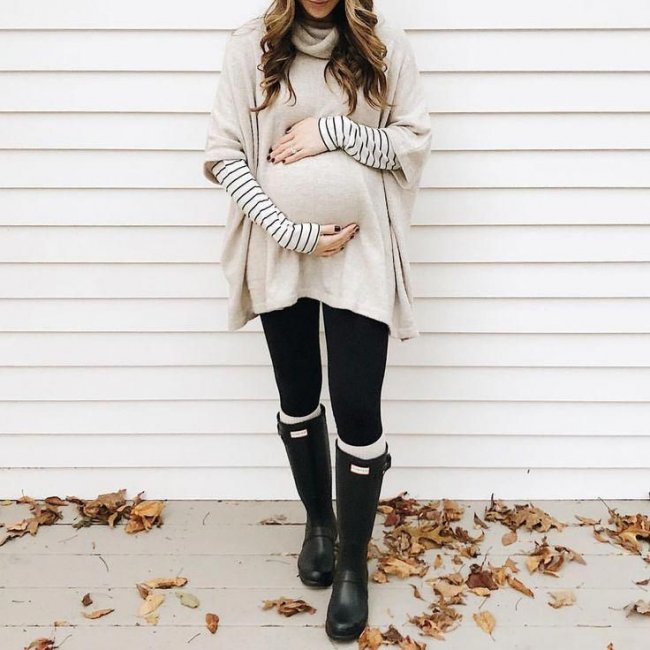 Трикотажная туника, пончо — несколько экзотичный силуэт для повседневного гардероба, но хорошее дополнение к базовому гардеробу женщины в положении.