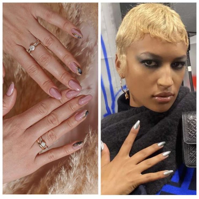Снова возвращается гранжевый маникюр 90-х в стиле металлик, выбор оттенков большой. Если не хотите выделять таким лаком все пальцы, можно ограничится дизайном на двух ногтях.
