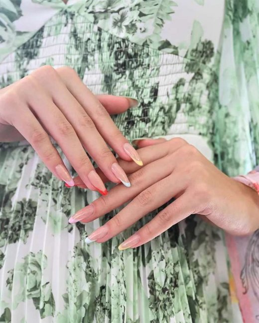 На фоне гранжа и блеска выделяется яркий френч. Подчеркивать линию улыбки в маникюре предлагаю сразу несколькими лаками броских цветов. Присмотритесь к такому френчу, если вам нужна терапия, чтобы поднять настроение.