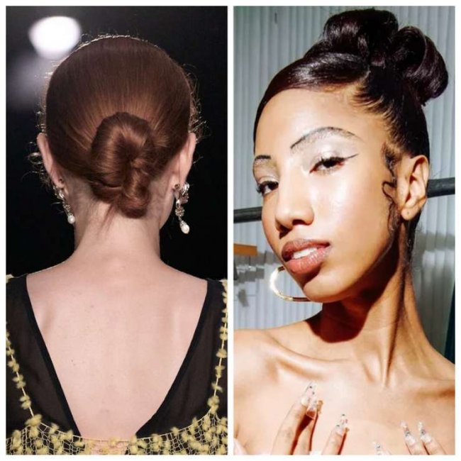 В моде, как академические пучки в стиле балерины, так и легкая небрежность, когда из композиции могут торчать волоски. Выделяются из этого ряда пучки-бутоны.