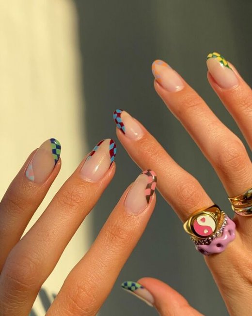 Это не французский маникюр вашей бабушки и вам понравятся любые сочетания цветов. Используйте различные цвета, как показано на рисунке или придерживайтесь меньшей палитры, например коричневого и белого, чтобы получить забавный нейтральный маникюр.