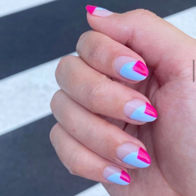 Также заманчиво погрузиться в цветовой круг с перекрывающимися фигурами. Замените ярко-розовый и нежно-голубой цвета на цвета, соответствующие сезону или мероприятию и получите классный маникюр к любому образу.