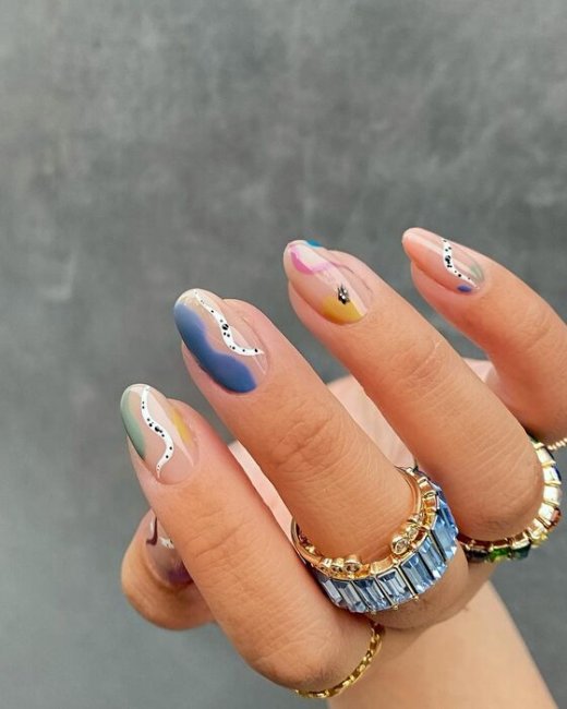Если абстрактные ногти кажутся неправильными или некрасивыми, то мягкая нейтрально-розовая основа делает эти цвета яркими и праздничными.