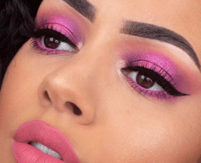 Сочетайте яркие глаза с не менее яркими губами в этом розовом макияже. Тени цвета металлик в сочетании с матовыми губами того же тона делают этот образ идеальным для вечеринки.