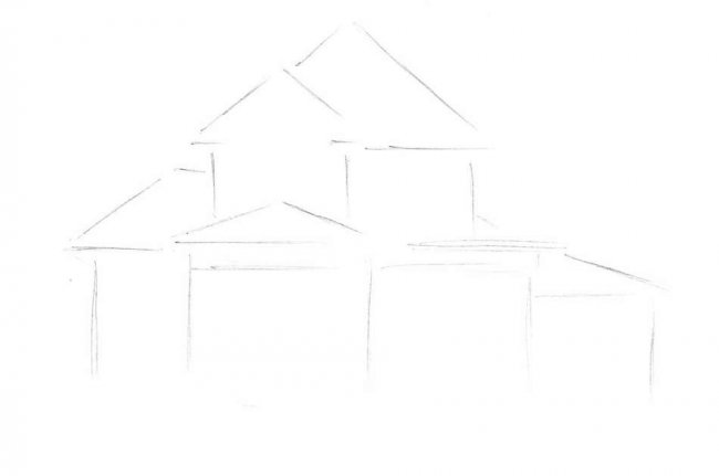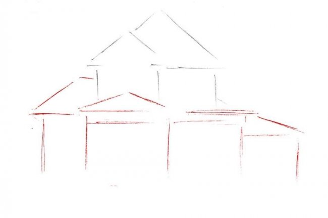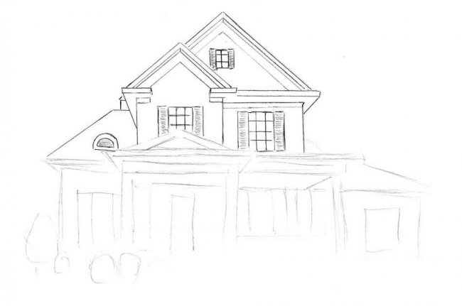 - Дом и строят, и строят, и рисуют снизу-вверх. Сделайте набросок первого этажа. Подумайте, какой будет крыша. В данном случае, она двухскатная.