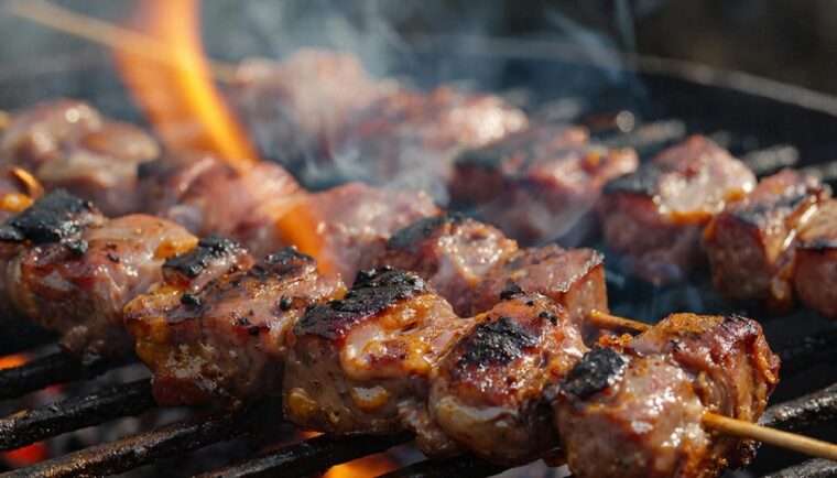 Главная ошибка новичка — жарка на открытом пламени. Мясо должно готовиться исключительно на жаре от углей. Когда угли покроются легким белым налетом (“поседеют”), пора выкладывать шампуры.