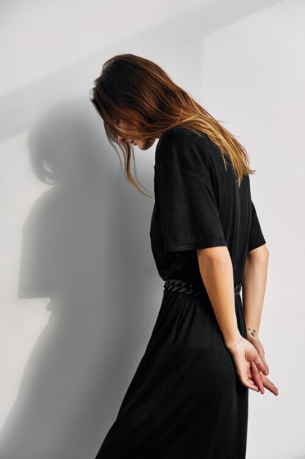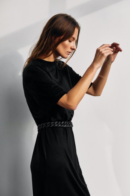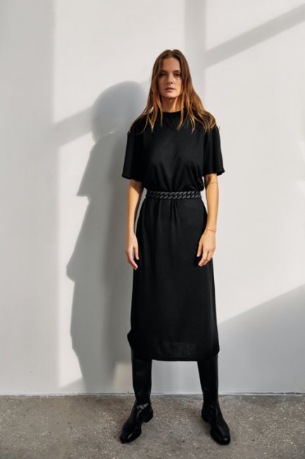 Трикотажное платье с коротким рукавом в черном цвете - основа капсульного гардероба и внесезонный тренд. В теплое время года его можно носить с босоножками и объемным клатчем по примеру streetstyle-активисток на Неделях моды, а зимой набросить на плечи интересный жакет и обуть жокейские сапоги. Бренд предлагает носить платье с поясом, подчеркивая линию талии.