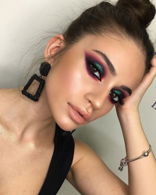 Яркие неоновые тени. Все, что нужно, это наложить слой теней (зеленые глаза подчеркнут синие, золотые, красные и фиолетовые оттенки).