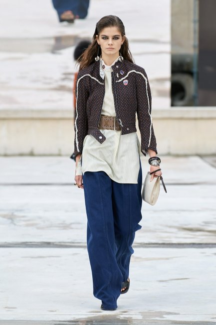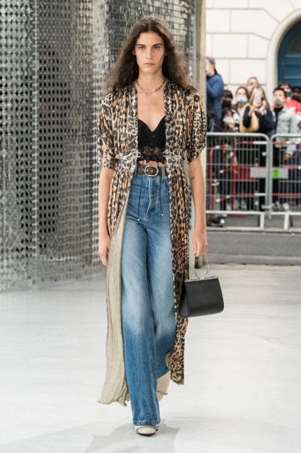 CelineШирокиеВ новом сезоне весна-лето 2021 в тренде расслабленные силуэты и непринужденные фасоны. Эта тенденция коснулась и денима. Так, в центре внимания оказались широкие джинсы, которые украсили коллекции многих брендов. Chloe показали экстра-объемные джинсы в темно-синем цвете, Jacquemus сделали ставку на приглушенно коралловый оттенок и завышенную посадку, а Christian Dior продемонстрировали свободные джинсы в паре с удлиненными рубашками.