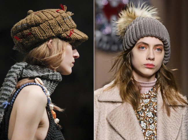 Также в тренде классические теплые вязаные шапки и береты, напоминающие французскую элегантность. В моде как базовые версии из уютной ткани и без орнаментов, так и более дизайнерские, такие как кепки, украшенные пайетками, с имитацией драгоценных камней или блестящих бусин и кристаллов. Подобные украшения появлялись на показах Iceberg, Pinko и Dolce & Gabbana.
