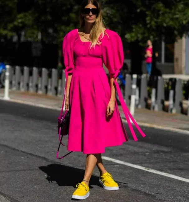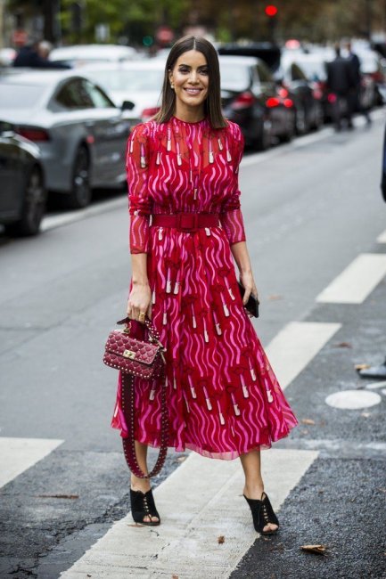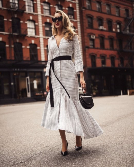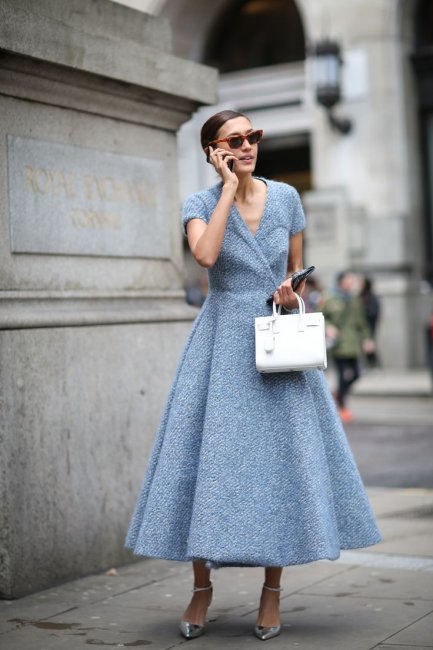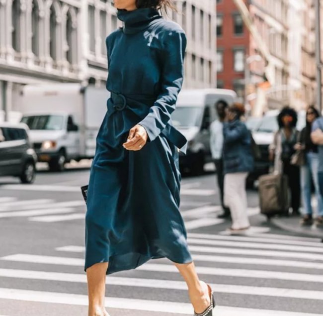 Ключевыми отличительными чертами этого летящего платья А-силуэта из мягкого материала стали: расширенный книзу подол, длинный рукав или три четверти, длина миди. В нынешнем сезоне эта модель легла в основу всевозможных деловых луков.