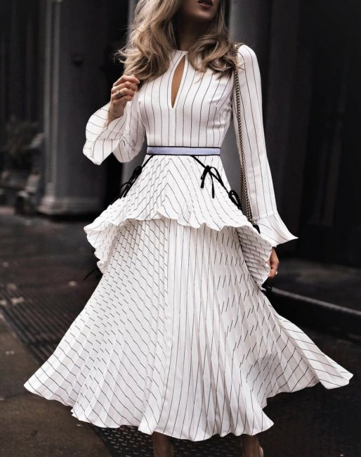 Дополнить платье сможет V-образный вырез, пуговицы, ремень. Подобные изделия могут быть либо светлых, либо темных колеров. Самыми популярными моделями стали модные офисные платья на осень-зиму 2021-2022 гг. в рубчик, имеющие свободный или облегающий силуэт. Не менее актуальны и вариации с запахом и рукавами-фонариками.