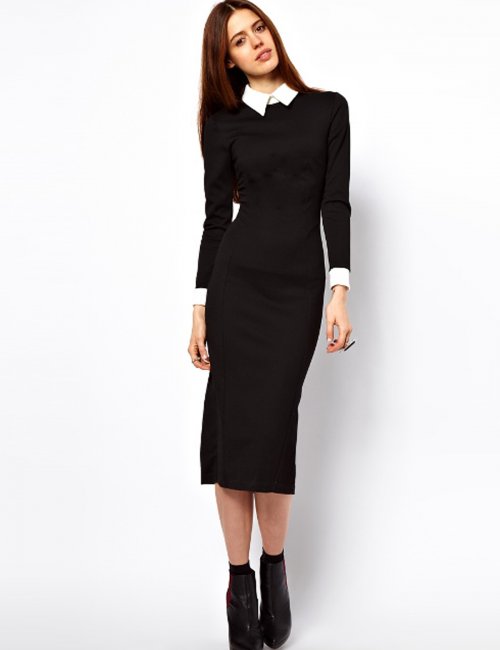 Восхитительно смотрятся модели с воротом, слегка открывающие декольте. Геометрический ворот, выступающий на контрасте с фактурным материалом, способен добавить офисному луку изюминку. Превосходным вариантом станет платье с воротником из трикотажа или брючного материала.