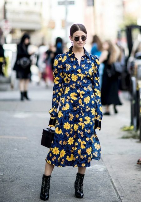 Модные офисные платья на осень-зиму 2021-2022 гг. для холодного сезона могут быть принтованными: с необычной клеткой (крупной, мелкой, разноцветной), с цветами, вертикальными полосами, геометрическими узорами.