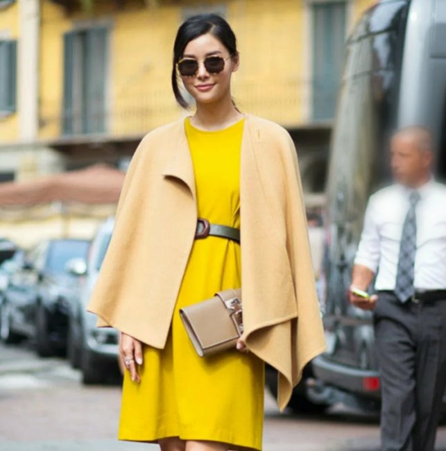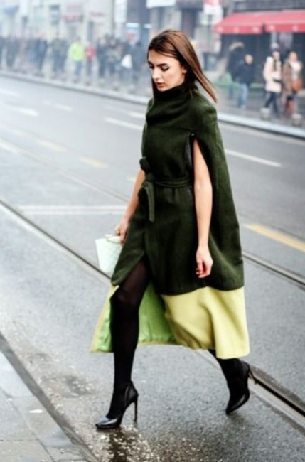 Подобный фасон нельзя характеризовать как новинку, так как его силуэт имеет давние корни. Однако для офисного гардероба платье с накидкой, которая прикрывает плечи и руки, как на фото, безусловно, открытие. Любительница этого фасона — Мелания Трамп.