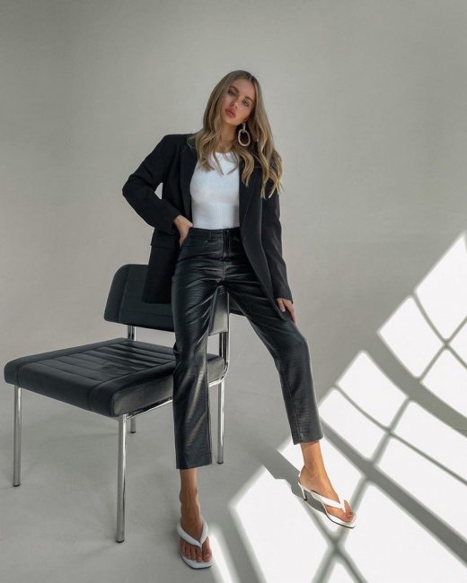- Модные тенденции уже отмечены в фото знаменитостей, топ-блогеров, телеведущих и исполнительниц – это скинни, кожаные брюки, и модели с разрезами на щиколотках. Последняя категория подойдет любой женщине, желающей визуально удлинить ноги или продемонстрировать дорогую обувь. Для скинни и кожи, как для сходного направления, плотно облегающего все изгибы плоти, нужно иметь хорошую фигуру, и даже рекомендации надевать к ним объемный верх этого требования к обладательнице топового аксессуара не отменяют.