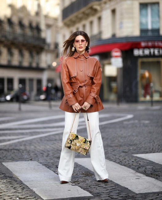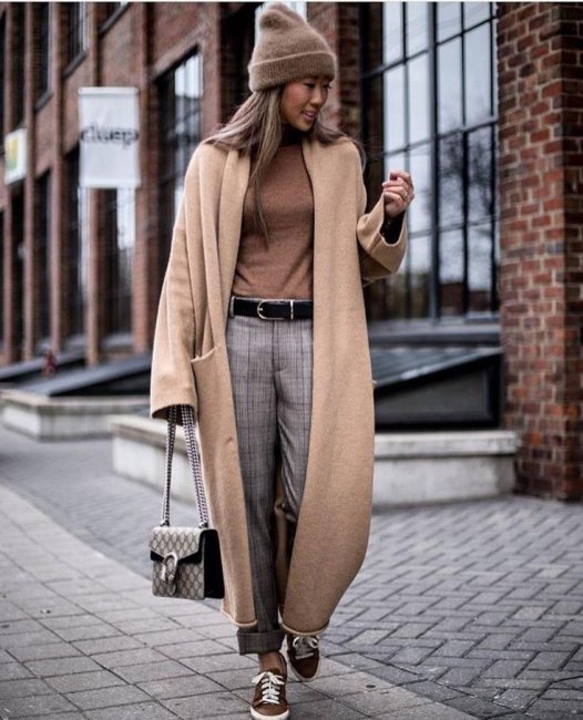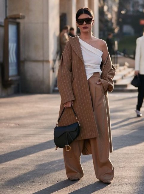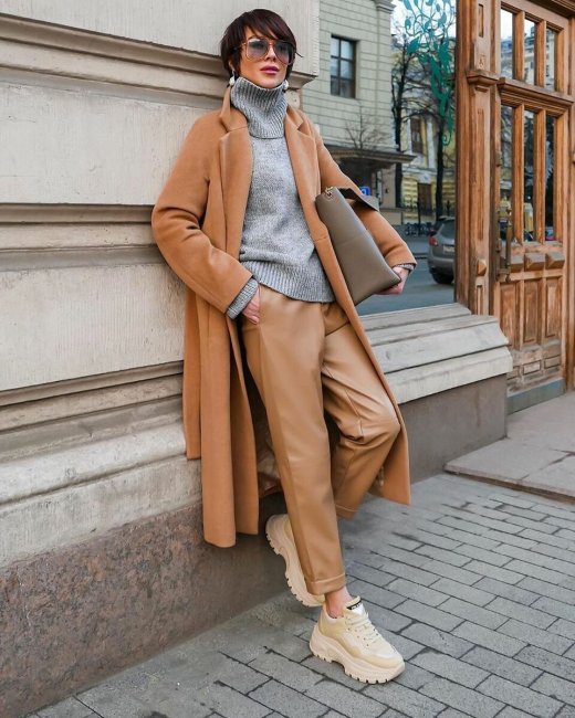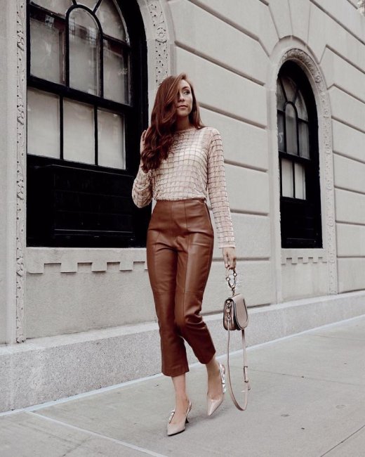 Модные женские брюки на зиму 2021-2022 гг. отличает предельное многообразие рекомендованных моделей. В тренде и строгая классика, и экстраординарные решения, вроде бежевого монохромного лука с кожаными брюками. Зимой, особенно в регионах с холодным климатом, такой вариант можно смело назвать экстремальным.