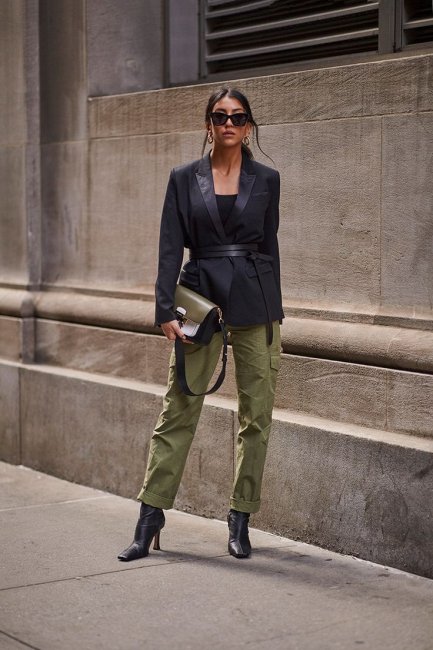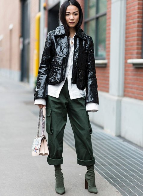 - Карго все еще актуальны и даже приобрели более устойчивые позиции по сравнению с прошлым годом. Их надевают с любым видом обуви, нет никаких ограничений в расцветках, несмотря на традиционно ограниченную песочно-бежево-оливковую гамму. Вариаций пошива всего две: с резинкой на штанинах или прямая. Принципиального отличия – накладные карманы на бедрах или икрах — тоже не отмечено. Новинки с фото есть в каждом из предложенных вариантов.