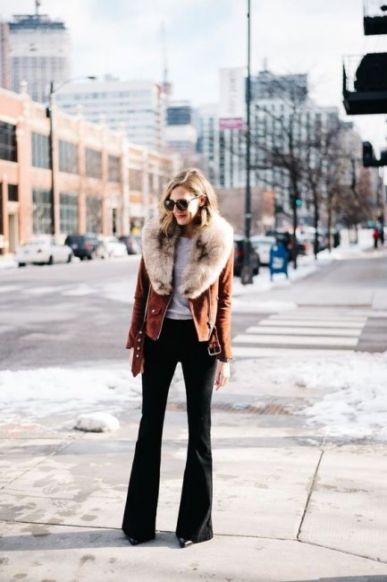- Брюки клеш – одна из самых актуальных тенденций. Несмотря на зимнюю непогоду, длина должна быть непременно до самого пола. По причине сильно расклешенных штанин эти модные женские брюки на зиму 2021-2022 гг. допустимо надевать с любой невысокой зимней обувью. Нет и особенных ограничений в комбинациях – допустимы разные вещи: от свитшотов до длинных жилетов, жакетов, рубашек и пуловеров.