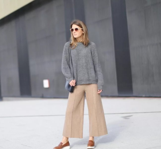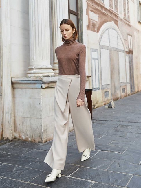 - Брюки палаццо, благодаря достигаемым визуальным эффектам и удобству в носке, плавно переместились из летнего гардероба в зимний. Требования к расцветкам не изменились. Их по-прежнему нет, поменялись только ткани для пошива – легкие сменились плотными. Одно ограничение есть – палаццо не шьют ни из модного бархата, ни из еще более трендовых плюша и велюра.