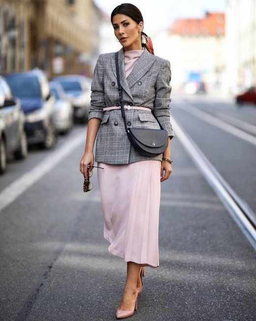 Оригинально выглядят изделия в клетку в многослойных луках, они замечательно сочетаются с пальто или тренчем. Женственный образ создается благодаря юбке плисе или летящему платью.