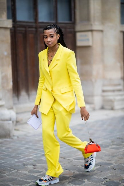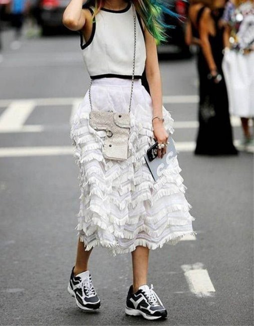 В нынешнее время кроссовки можно сочетать не только с джинсами, но и с юбками, платьями и даже брючными костюмами.