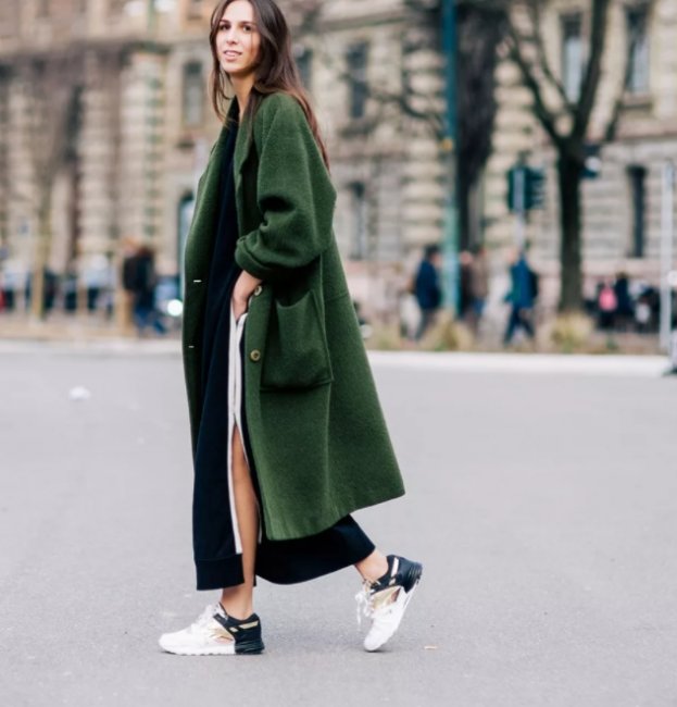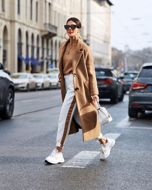 Пальто – тоже довольно универсальный предмет гардероба, который подходит и для офиса, и для прогулок, и для романтических свиданий. Классическую модель прекрасно украсят стильные кроссовки белого цвета. Оверсайз-пальто будет отлично смотреться с массивными ugly, а укороченное – с миниатюрной обувью. Само пальто может быть как застегнутым, так и нараспашку, а дополнить его лучше всего сумкой в соответствующем стиле и красивым шарфом.