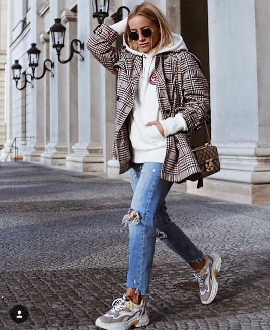 Кроссовки и джинсы – неизменный тандем, который можно увидеть на модницах уже очень много лет подряд. Меняются лишь модели. На смену классическим джинсам пришли «мамсы», «бойфренды», потертые, рваные модели. Самый выигрышный вариант для лука в стиле стрит-стайл – джинсы, кроссовки, поясная сумка и кожаная косуха.