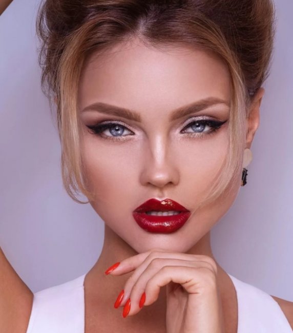 Классика будет популярной всегда, и это можно отметить в коллекциях многих известных кутюрье. Помады насыщенного красного оттенка с плотной текстурой не только украсят губы модниц во время празднования Нового года 2022, но и будут хорошо дополнять макияж для голубых глаз. При этом глаза можно сделать выразительными или использовать небольшое количество туши и нанести лишь тонкие стрелки на веки.