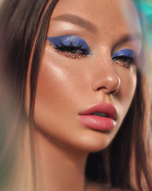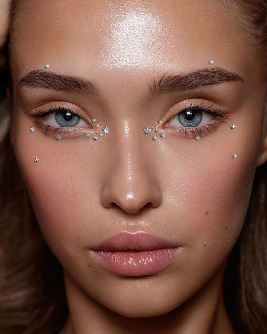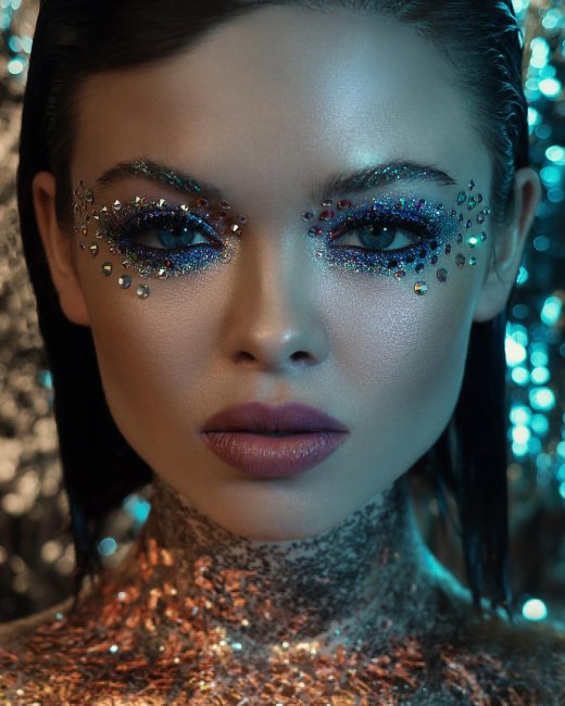 Экстравагантным дамам придутся по вкусу переливающиеся пайетки и стразы. Их можно наносить не только на веки, но и на щеки и область губ.