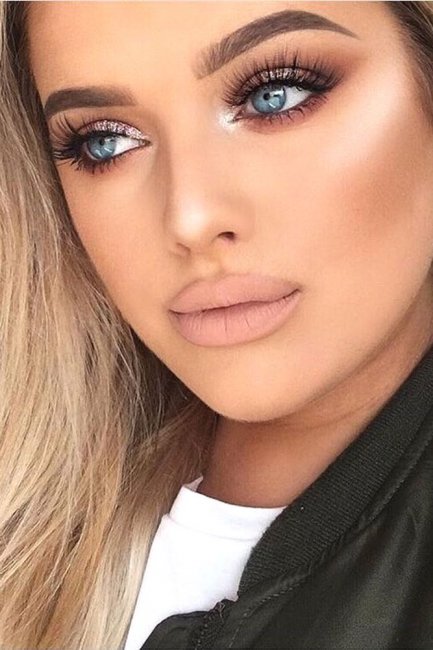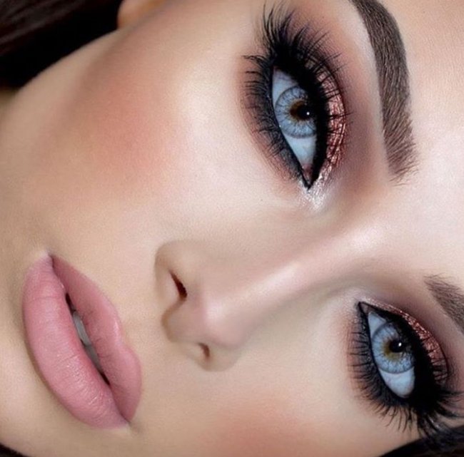 Нежным и романтичным натурам наверняка придется по вкусу эта необычная идея. Ничего сложного в этом нет, нужно просто дополнить нанесенный макияж милыми сердечками небольшого размера в области верхних век. А чтобы они красиво выделялись в макияже, для их нанесения используйте насыщенные оттенки коричневого, на которых маленькие нюдовые сердечки будут смотреться просто восхитительно. Эта необычная идея поможет создать романтичный макияж на Новый год 2022 для женщин с голубыми глазами.