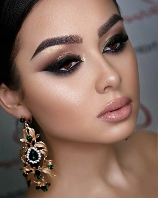 Содержание Актуальные бьюти-тренды Советы специалистов: макияж для кареглазых женщин «СМОКИ АЙЗ», или дымчатый макияж для карих глаз Другие виды макияжа на Новый год для карих глаз Цвет волос и цветовая гамма Новогодняя ночь — волшебный праздник, на котором каждая женщина хочет выглядеть привлекательно, стремится стать грациозной и обольстительной королевой бала. Достичь этой цели поможет правильно подобранный, выразительный макияж на Новый 2022 год для женщин с карими глазами. Актуальные бьюти-тренды Стремление к естественности, натуральности образа превалирует в мире моды, в том числе в искусстве нанесения макияжа. Но новогодняя ночь — тот исключительный случай, когда можно не следовать этому тренду. Напротив, следует создать яркий и привлекательный образ. Кареглазым женщинам, можно сказать, повезло, так как под этот цвет радужной оболочки подходят практически все оттенки палитры красок для мейкапа. Выразительный макияж — лишь часть праздничного образа, который нужно привести в гармоничное сочетание с другими элементами. Необходимо обратить внимание на одежду, бижутерию, цвет волос, укладку. При выборе техники макияжа учитывают индивидуальные характерные детали внешности. Ориентируются на овал лица, натуральный оттенок кожи, обращают внимание на разрез глаз. Модные тенденции для новогоднего макияжа в 2022 году: предпочтительнее, чтобы создаваемый образ гармонировал с символом года; мейкап должен быть выразительным, необычным; рекомендуют использовать медные, золотистые, серебряные оттенки; уместны вкрапления сияющих, блестящих элементов декоративной косметики; в моде перламутровые, мерцающие переливы. Визажисты рекомендуют в макияже сделать акцент на область глаз. Советы специалистов: макияж для кареглазых женщин Перед нанесением декоративной косметики нужно подготовить лицо. Желательно сделать маску, массаж, чтобы кожа выглядела отдохнувшей, увлажненной. Сначала наносят базу, используя праймер. Косметическое средство впитается, сольется с поверхностью кожи, выровняет ее, скроет мелкие пигментные пятна, морщинки. Для этих же целей используют консилер, он маскирует даже мимические морщины, круги под глазами. Эти средства наносят тонким слоем, чтобы они могли полностью впитаться и равномерно распределиться. Затем при помощи оттенков тонального крема моделируют контуры лица, слегка выделяя область скул. Визажисты отмечают, что яркие румяна не в тренде, акцент на скулах лучше делать едва заметным. Интересно! Модное окрашивание волос 2022 года на длинные волосы Доминирующая цветовая гамма макияжа на Новый 2022 год для карих глаз — спектр медно-золотистых, серебристых оттенков, которые можно дополнить зелеными, фиолетовыми. Выразительно будет смотреться цветная тушь, которая выделит глаза, сделает макияж неординарным, праздничным, ярким. К декоративному новогоднему макияжу можно добавить немного блесток. Постарайтесь сбалансировать мейкап. Если выделяете область глаз, помаду подбирайте менее яркую. И, наоборот, в случае, когда макияж глаз сдержанный, в персиковых, песочных, серебристо-серых тонах, можно смело выделять губы. Линия бровей должна выглядеть естественно, поэтому достаточно подвести карандашом натуральный контур, слегка подчеркнув его. В новогоднюю ночь уместно использование подводки, стрелок в