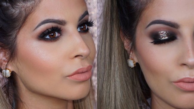 В новогоднюю ночь макияж должен быть сказочно красивым. В этом помогут блестящие и мерцающие глиттеры, шиммеры. Для кареглазых представительниц прекрасного пола больше всего подходит гамма золотых, бронзовых цветов.