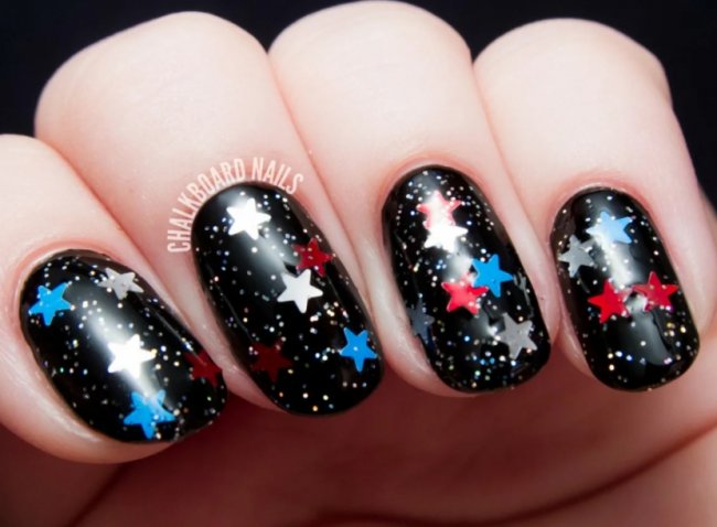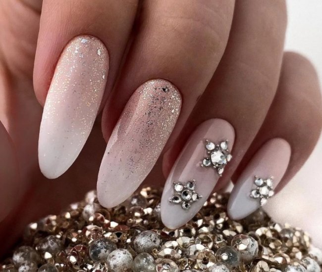 Смелые девушки могут рискнуть и создать на ногтях настоящее произведение маникюрного искусства. Этого можно достичь при помощи стразов. На ногти наносят монохромное и глиттерное покрытие, после чего на одном из них выкладывают звездочку из камешков. В таком случае лучше всего использовать бусины разных размеров. Так объемный рисунок будет интереснее смотреться.