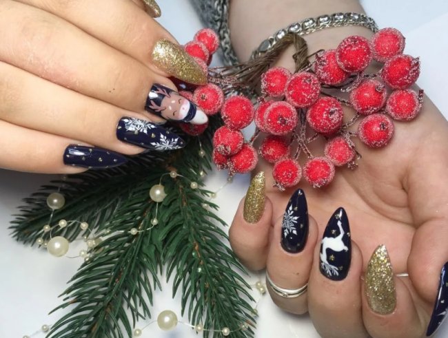Существует несколько вариантов оформления маникюра на Новый год 2022 на длинные ногти. Каждый отличается не только декором, но и техникой исполнения.