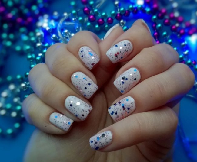 Это могут быть разноцветные, мелкие и даже крупные блестки, выполненные в любой технике. Такой дизайн подойдет как для длинных, так и коротких ногтей. В качестве основы лучше всего сделать омбре, монохромное покрытие, френч или паутинку. Длинные ногти лучше всего украшать крупными стразами, а короткие – мелкими. При этом не играет роли форма блесток. Здесь женщины могут не ограничивать свою фантазию.