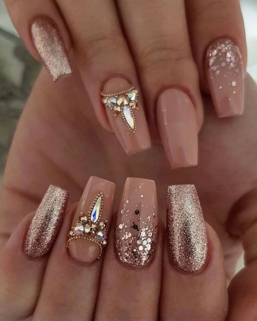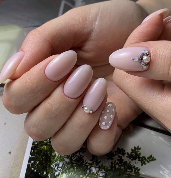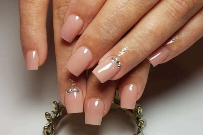 Нюдовые оттенки гель-лака и стразы — одно из самых удачных сочетаний предстоящего сезона. Этот вариант маникюра универсален, он подойдет и для повседневной носки в офис, и дополнит любой праздничный образ.