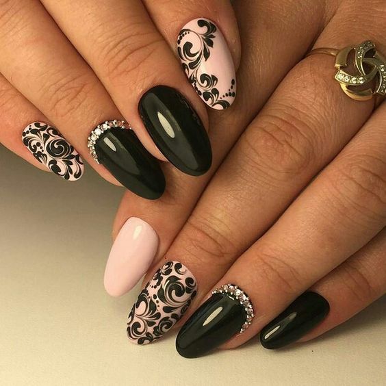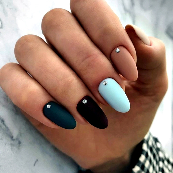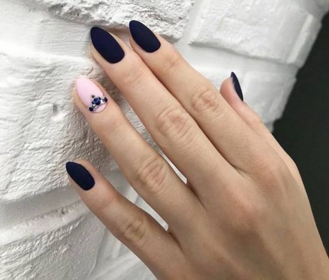 На длинных ногтях стразы идеально сочетаются со светлым лаком. Если предпочтение отдается темным оттенкам, следует использовать матовый топ.