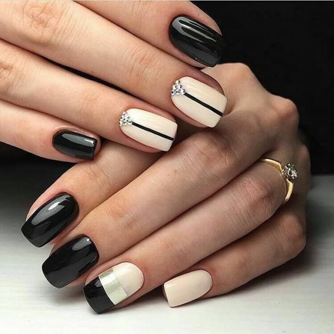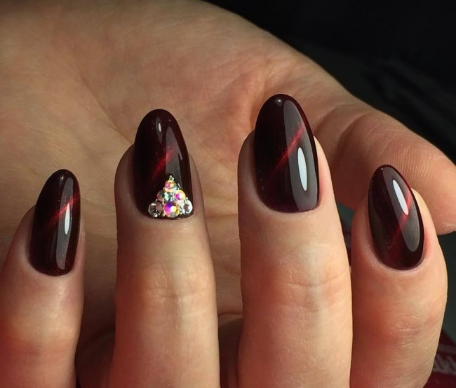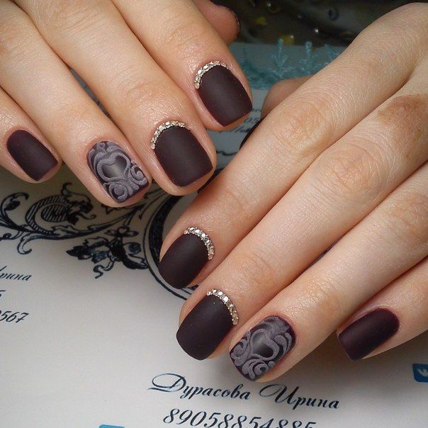 К модным тенденциям маникюра со стразами в 2022 году, судя по фото стилистов, будет относиться и сочетание камней с темным лаком. Такой дизайн предпочтительней использовать девушкам с короткими ногтями.