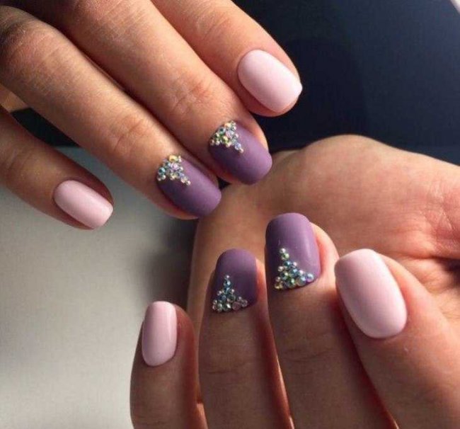 Одним из трендовых вариантов оформления маникюра будет покрытие ногтей цветом блаш и небольшие стразы около кутикулы по одной на каждом ногте.