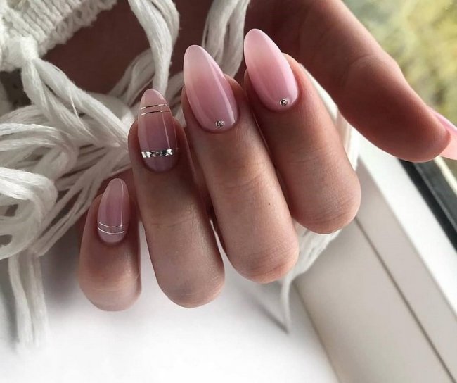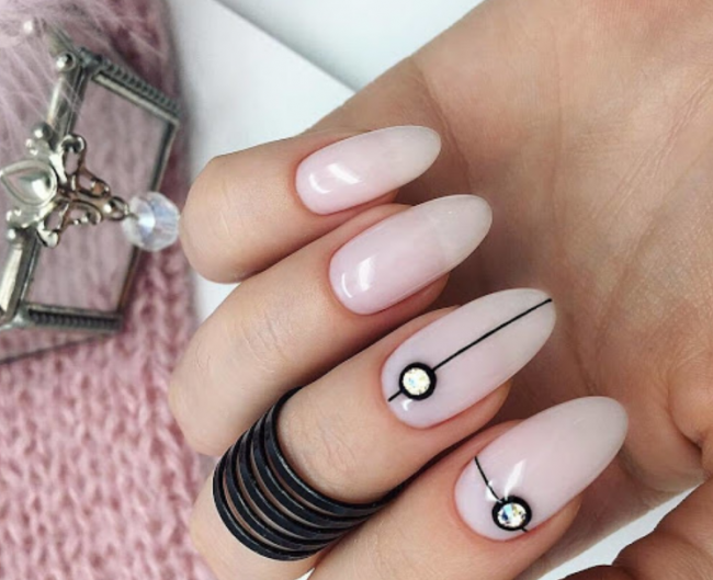 На нюдовую подложку можно нанести линии или геометрический рисунок, добавив по углам стразы. Необычно смотрятся камни, наклеенные в хаотичном или шахматном порядке. Такой дизайн можно сделать на всех ногтях или только на 2-4 пальцах.