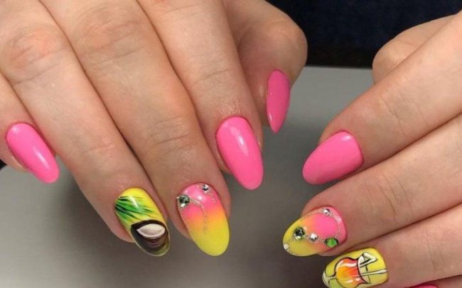 Такой дизайн следует продумать до мелочей. Не стоит задействовать более 1-2 пальцев под яркий рисунок. Иначе можно получить не стильный маникюр, а лепнину, которая никогда не будет аккуратной. Стразы обязательно должны стать частью ногтевого арта: