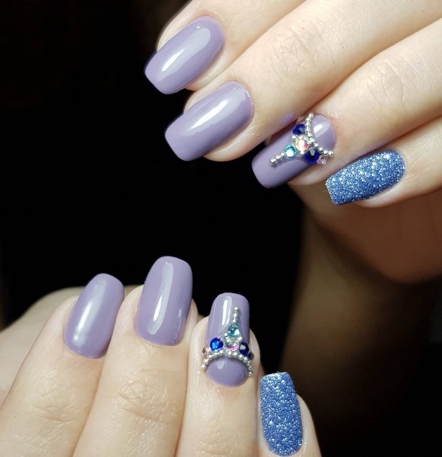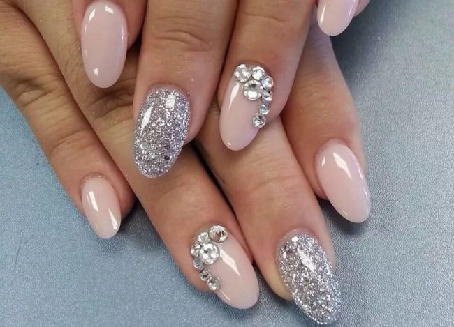 допускается плотное нанесение блесток на всю ногтевую пластину, но стразы следует использовать в минимальных количествах.
