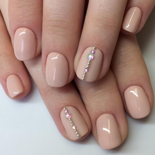Даже с использованием страз можно создать минималистичный дизайн на ногтях. Лак подбирается однотонный для всех ногтей в базовом цвете: