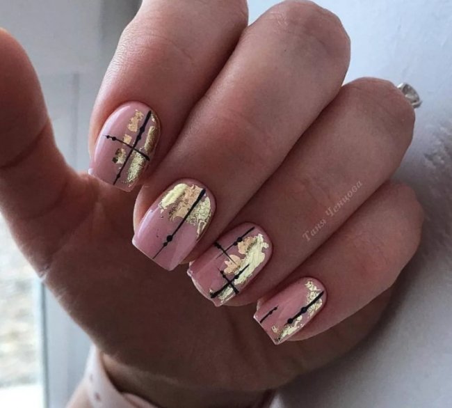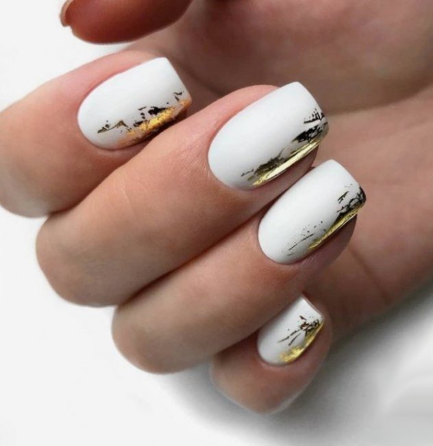 Использование золотой или серебряной фольги, которая наносится на ногтевую пластину отдельными элементами, за счет чего позволяет имитировать старую патину. В этом случае базовый фон должен быть либо максимально светлым, либо, как противовес, темным.