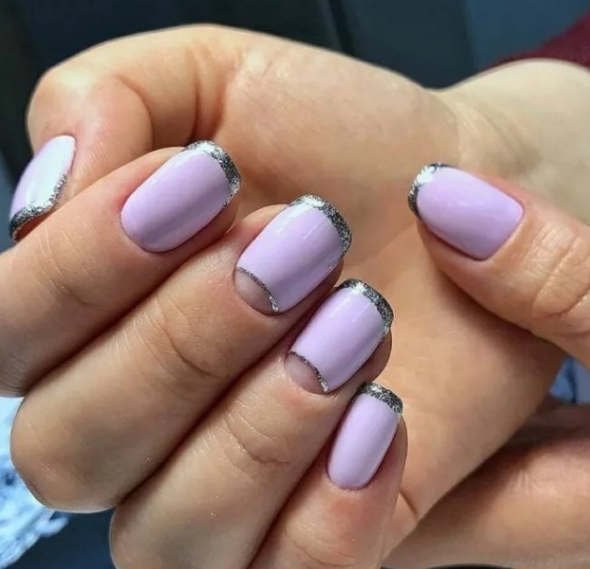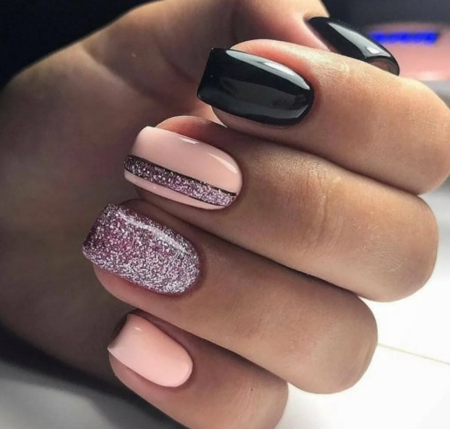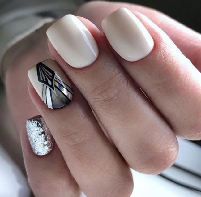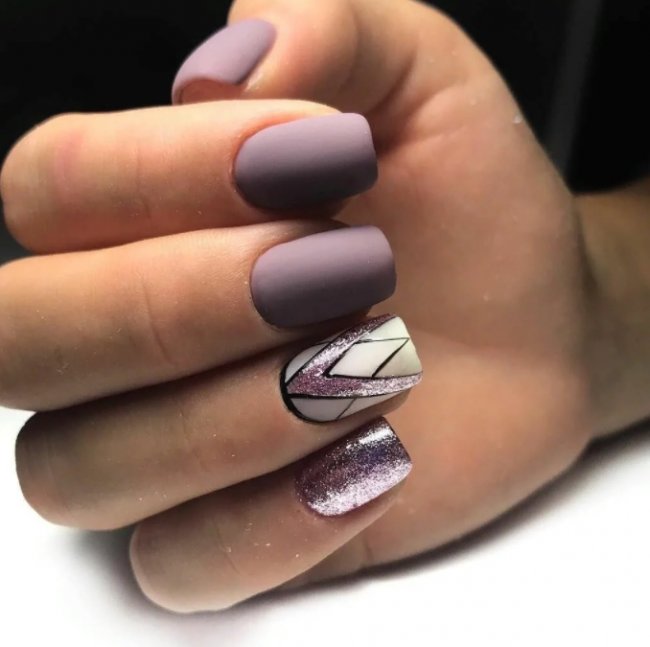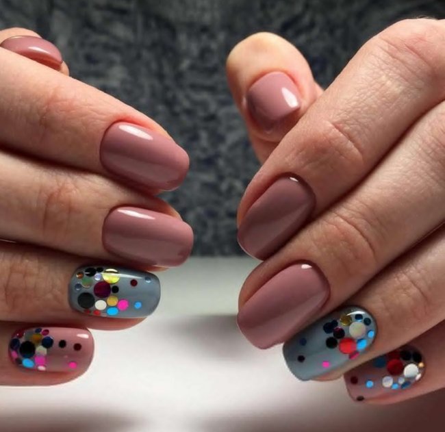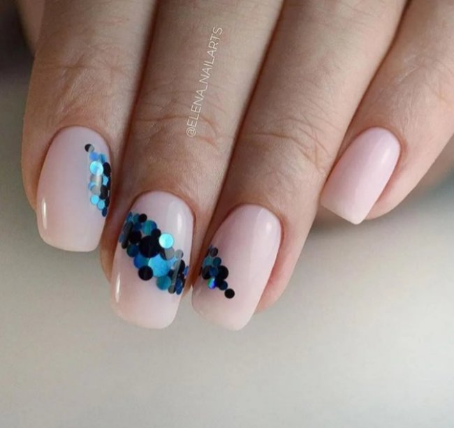 Матовый нейтральный лак, нанесенный по всем ногтевым пластинам, дополненный блестками. Но блестящие элементы должны быть точечными, чтобы они только оттеняли основной фон.