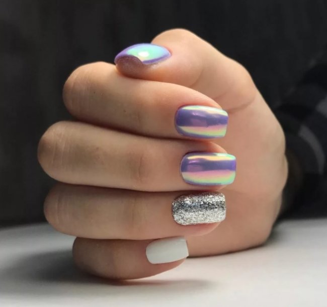 Еще один стильный вариант маникюра достигается при использовании разных втирок. С помощью такой пудры можно добиться самых интересных эффектов на ногтевой пластине – от идеального металлического блеска разного оттенка до радужных переливов или жемчужного сияния.
