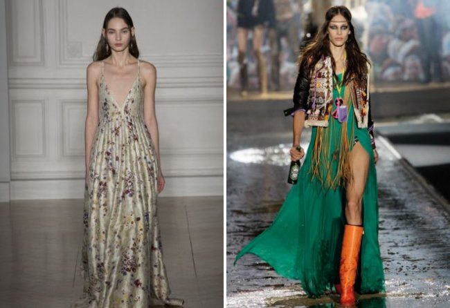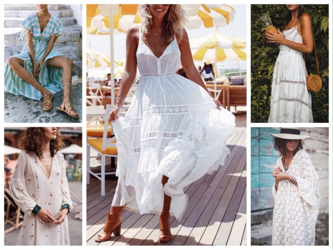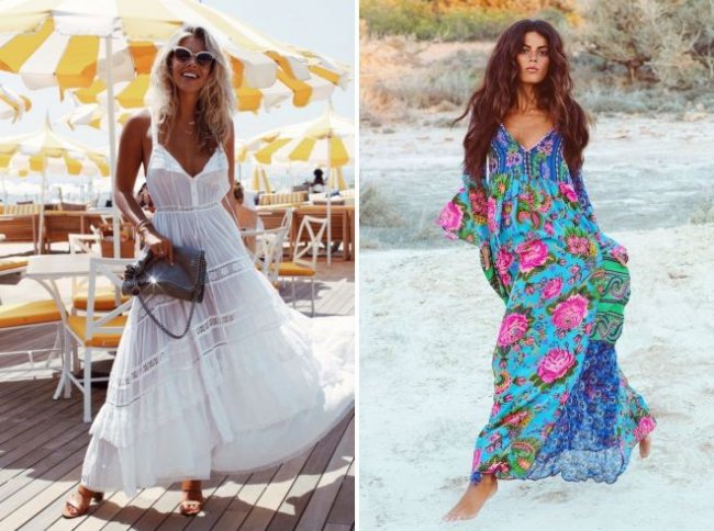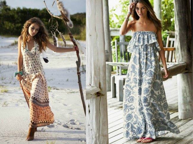 Самые модные платья в стиле бохо выполнены из воздушных материалов в нейтральных, приглушенных цветах, обычно в оттенках белого или бежевого. Сарафаны в стиле бохо прекрасно сочетаются со многими элементами одежды, особенно с многочисленными декоративными аксессуарами. К летним платьям такого типа прекрасно подходят: